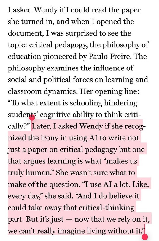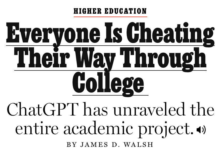 Before moving on, we should add a little context . As it happens, I spoke to James Walsh for the story, and while I am not quoted, I can perhaps detect some influence of what I had to say, namely that students are behaving according to the incentives of the system within which they exist. When you are judged solely on the product, when the stakes of good grades seem existentially high, when there is doubt or uncertainty about your ability to perform to the standard you believe is expected of you, reaching for this aid is understandable. If you do it often enough and the system seems to keep rewarding you for it, why would it become anything other than normal?