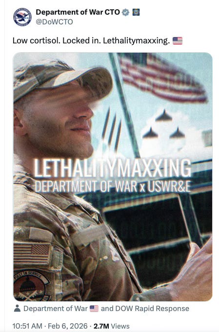 Another video of combat operations intermixed with footage from the Call of Duty video game was released by the government to social media. The concerted push to blur the line between what is real and what is fake is deeply disturbing, a way to desensitize us to dehumanization. Naturally, the Pentagon has dubbed their approach, “lethalitymaxxing.”
