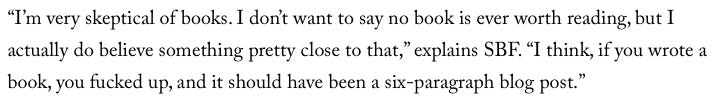 To those of us who read novels, this sounds nutso, but the attitude is pretty pervasive. The tech bro culture disdains reading books that could be distilled down to bullet point lists. Disgraced crypto-scammer Sam Bankman-Fried once said to an interviewer: