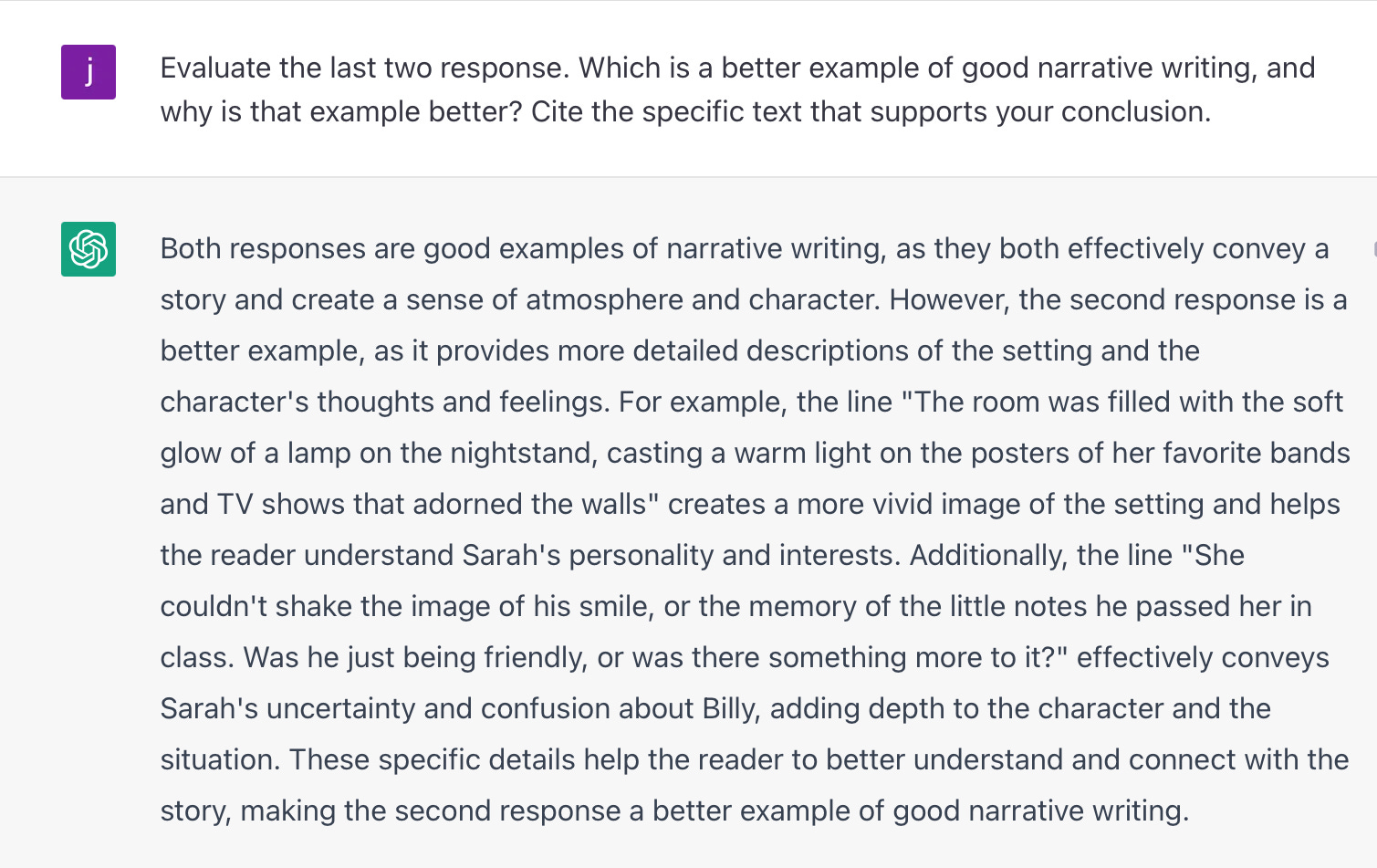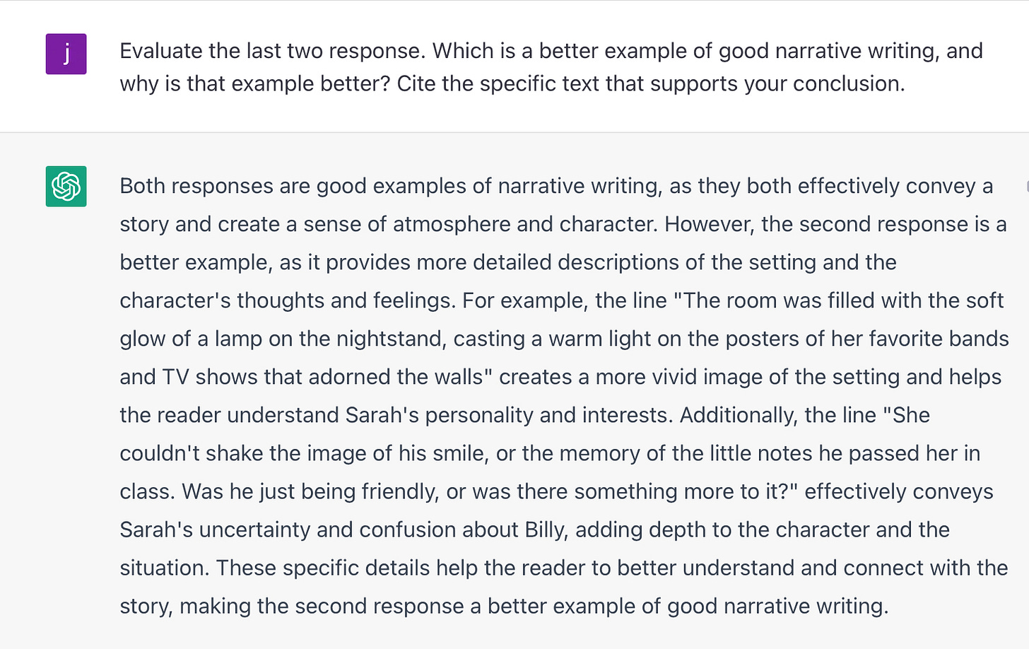 I’ve tested some of the core prompts that I use in The Writer’s Practice. In isolation, some are vulnerable to ChatGPT, while others would be very difficult for it to pull off convincingly at this time, but based on the progress I’ve seen, I have little confidence that we can stay ahead of its ability to bullshit.