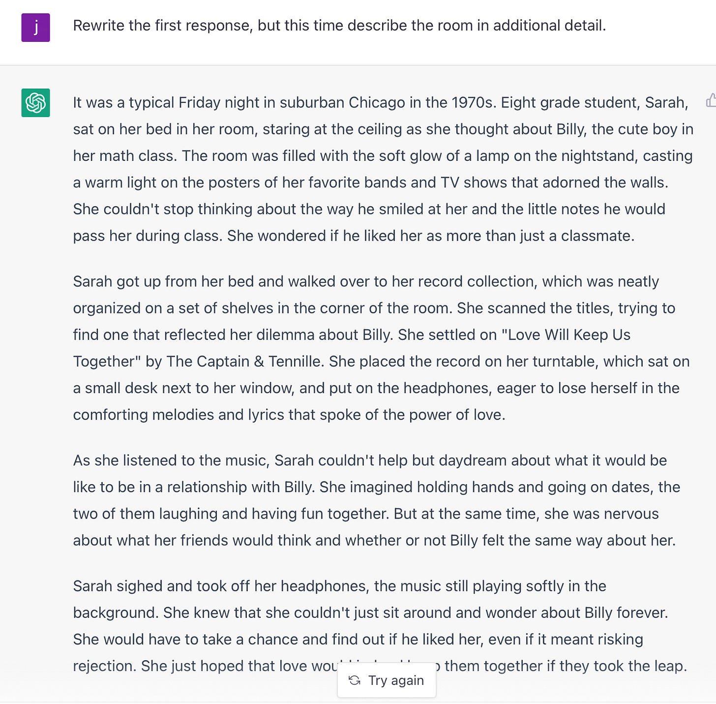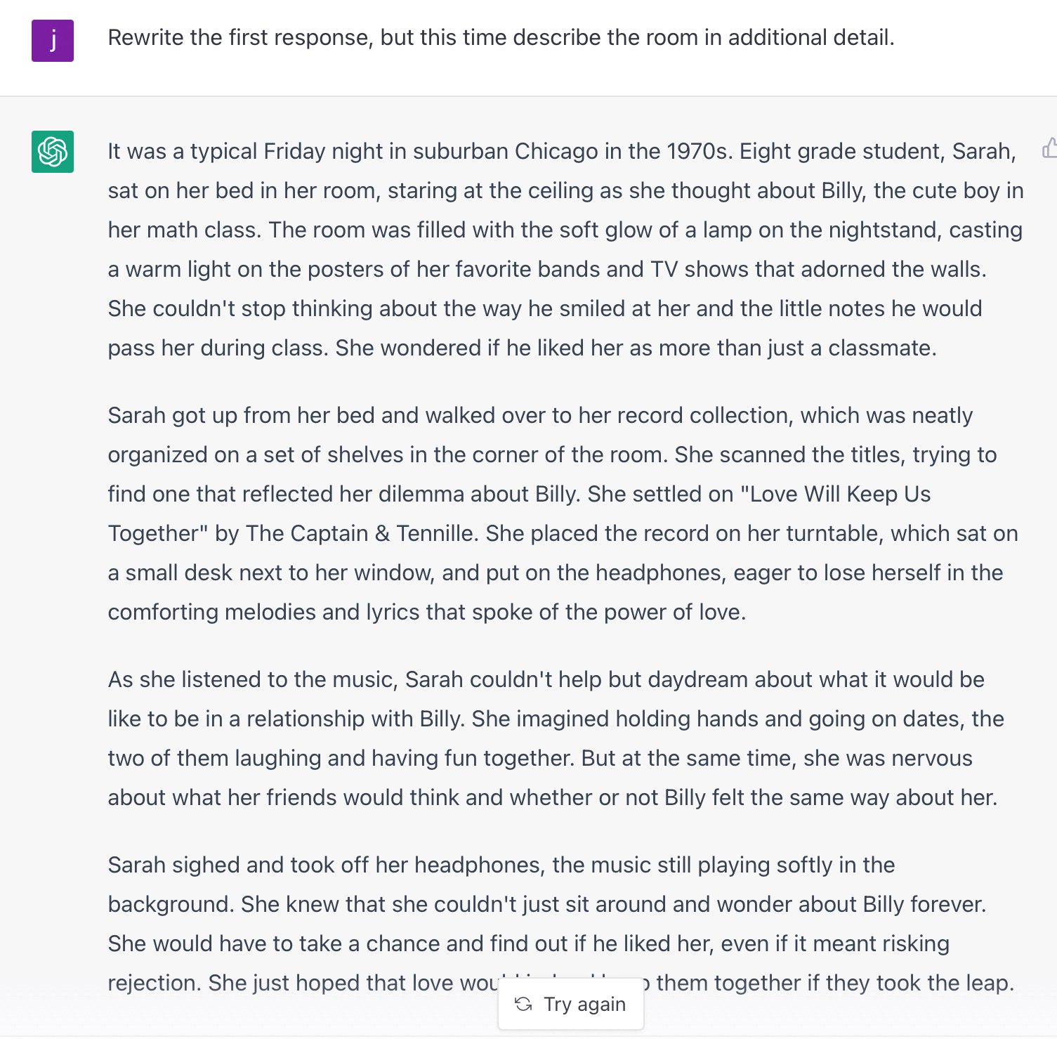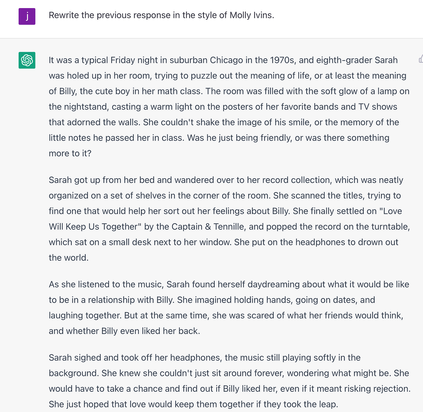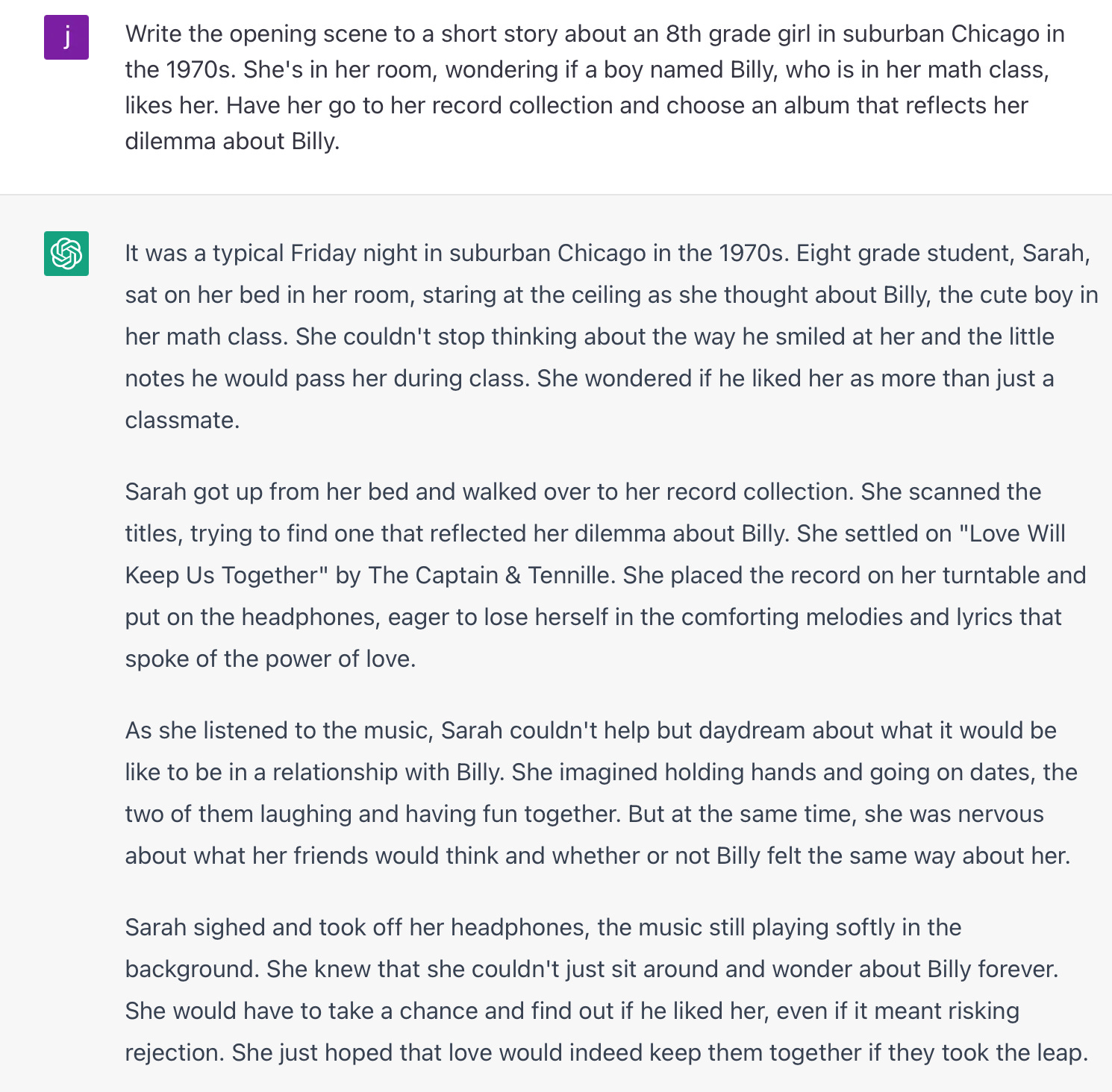 I cannot emphasize this enough: ChatGPT is not generating meaning. It is arranging word patterns. I could tell GPT to add in an anomaly for the 1970s - like the girl looking at Billy’s Instagram - and it would introduce it into the text without a comment about being anomalous. It is not entirely unlike the old saw about a million monkeys banging on a typewriter for along enough, that one of them would produce the works of Shakespeare through random chance, except this difference is, ChatGPT has been trained on a data set that eliminates all the gibberish.