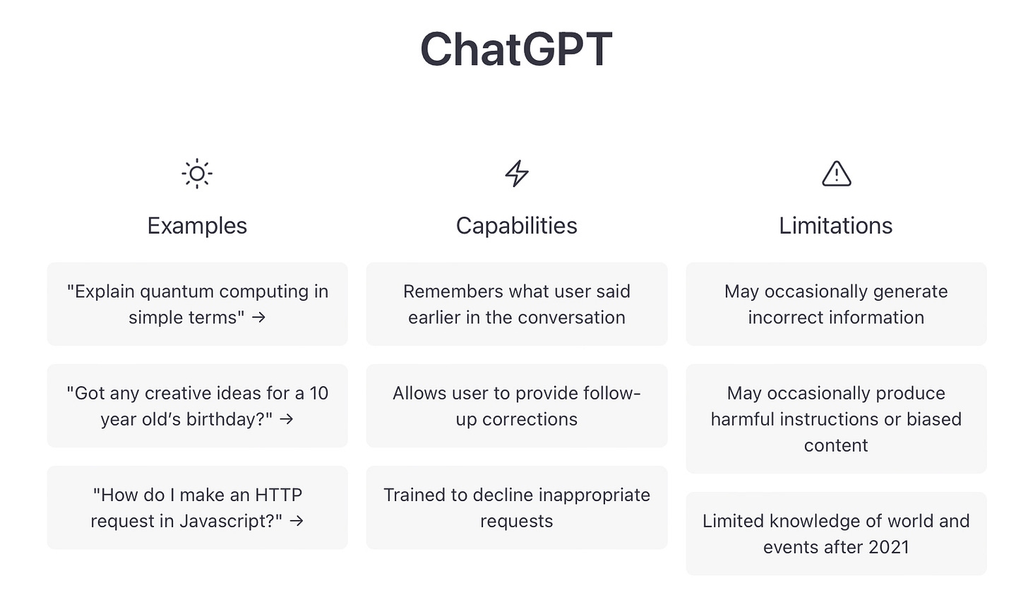 This snapshot from the ChatGPT homepage is a good overview of what OpenAI says ChatGPT can do.