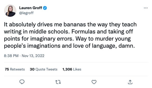 It is difficult to overstate how bad things have been for a couple of generations of students. This tweet from the writer Lauren Groff (Matrix), lamenting what school had done to her son’s attitudes towards writing is a not uncommon testimony I hear from parents and students alike.