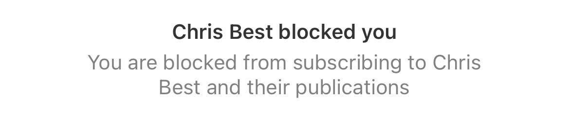I try not to be paranoid, and don’t pretend I’m really important enough to warrant any headspace among the Substack triumvirate, but it strikes me as not great if one of the fellas who owns the place has blocked you.