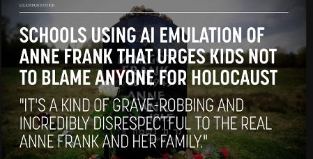 who knows much more than me doesn’t think so either.) I don’t get to cozy up to the people who run these companies and who advise governments or have them on my widely listened to podcasts which rarely seem to platform dissenting voices. (Why is that, by the way? Why won’t Kevin Roose and Ezra Klein talk to me? I know for a fact they’re both aware of my book and my work.) Instead, I talk to teachers and students and readers and writers about why that powerful AI is not a replacement for your unique intelligence, and anyone who tells you otherwise is asking you to just give up on your own humanity.Last Sunday I was delivering a public talk at the Barrington White House cultural center when I choked up while articulating my objection to historical chatbots like one trained to emulate Anne Frank that would not condemn the Nazis.