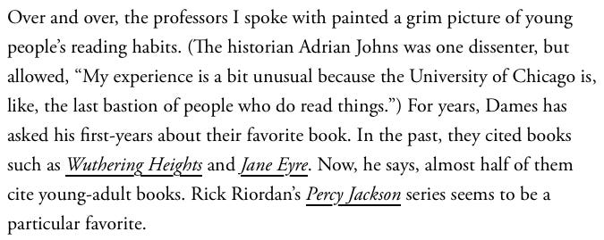 Anyway, I say this so we know to take the article on how students at Columbia University can’t read books with at least some grains of salt. We do not need to reach full moral panic stage about this stuff. (Post initial publication edit: I also recommend reading this newsletter from Carrie M. Santo-Thomas, one of the teachers who was interviewed by Horowitz's, who says “The Atlantic Did Me Dirty.” )