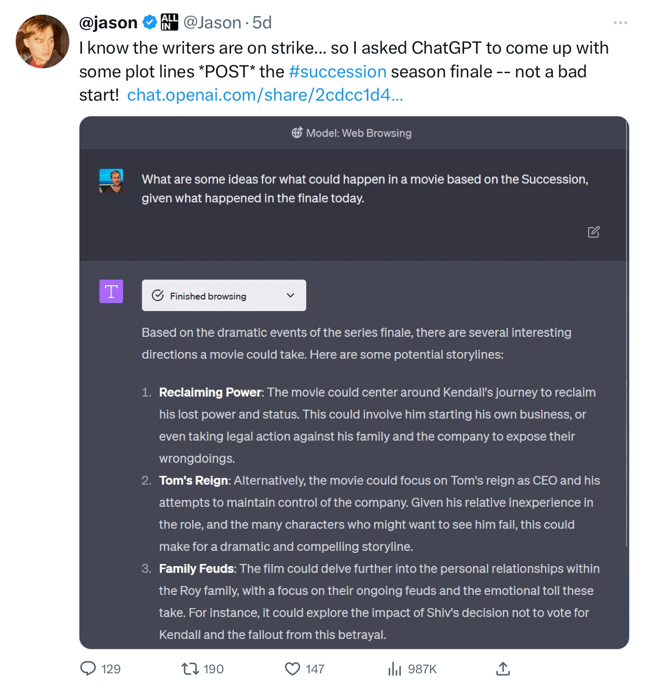 “Not a bad start…” I honestly don’t know what to say about this other than, again, this man is an idiot and thinking this is anything like the start of the creation of a text that may be substantive, non-disposable, even art (as I think Succession achieved) is to have zero understanding of creativity, humanity, or life on this Earth.