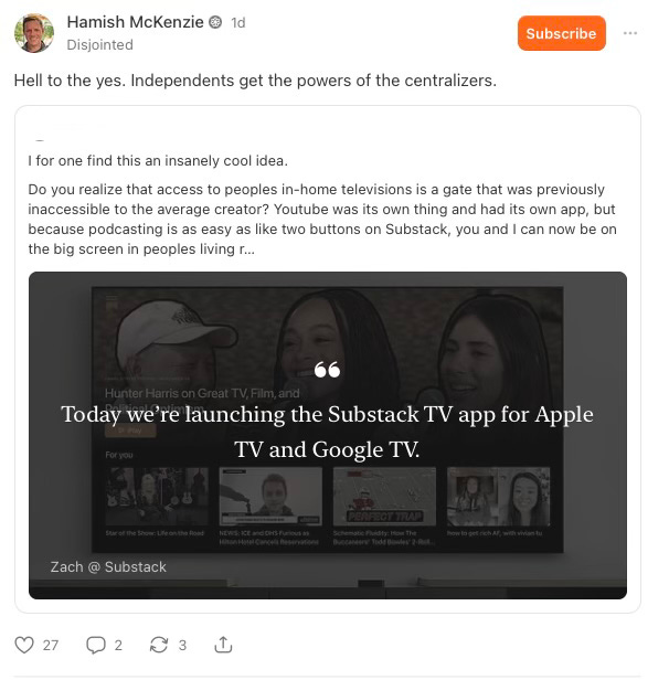 In Substack Notes, Substack co-founder Hamish McKenzie announced the launch of a beta version of Substack TV, an app download available on Apple TV and Google TV.