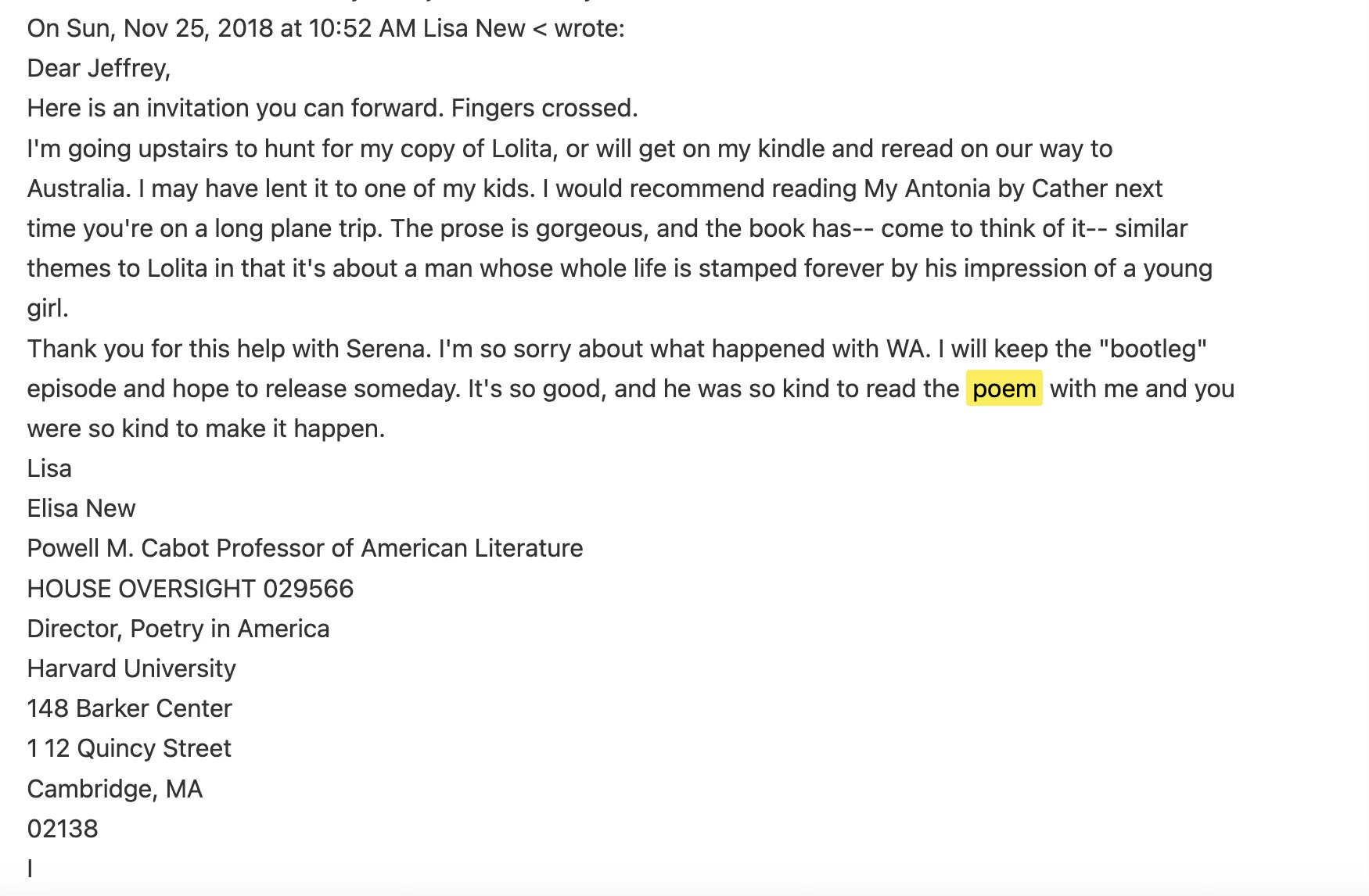 Speaking of flattering the sensibilities of a pedophile sex trafficker, I was umm…concerned by this message to Epstein from Elisa New, wife of Larry Summers, and professor of English at Harvard, in which she recommends Willa Cather’s My Antonia by comparing it to Lolita.