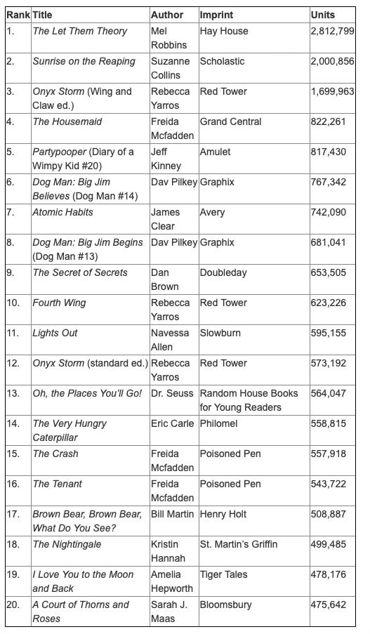 But then I looked at the list of the 20 most purchased print books of 2025 and noticed something interesting. I’ve only read two of them (you can guess which ones and I’ll reveal it at the end):
