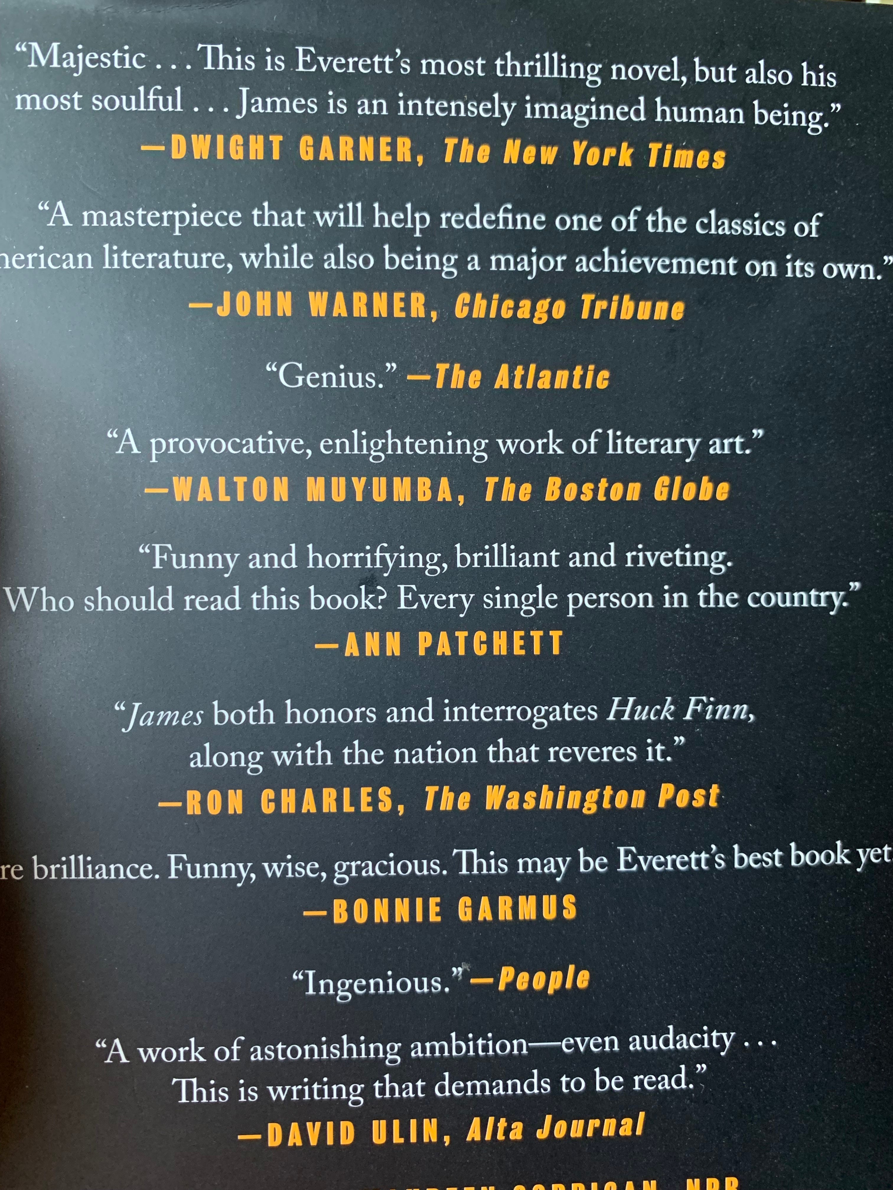 Anything is possible, and there’s no doubt that Percival Everett loves his extratextural puzzles, particularly in the interest of satire. There’s also no doubt that there’s similarities between the economiums given to Fuck (the final title of My Pafology) and the reviews of James, but when it comes to whether or not James is a My Pafology-type attempt, my take is…nah.