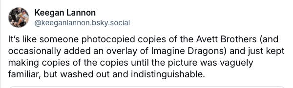 Someone will read this and tell me that as long as people like it, who cares? Plenty of pop music is derivative and people eat it up. There is something called The Velvet Sundown, which is an AI-generated “group” getting millions of plays on Spotify.