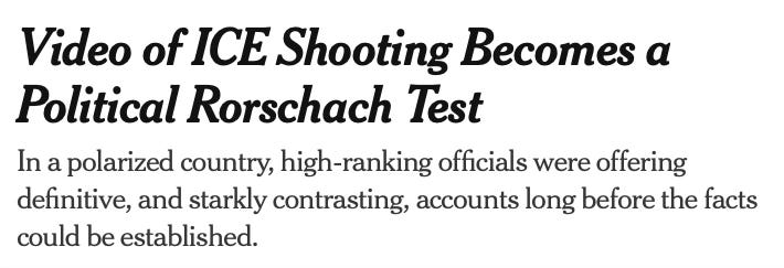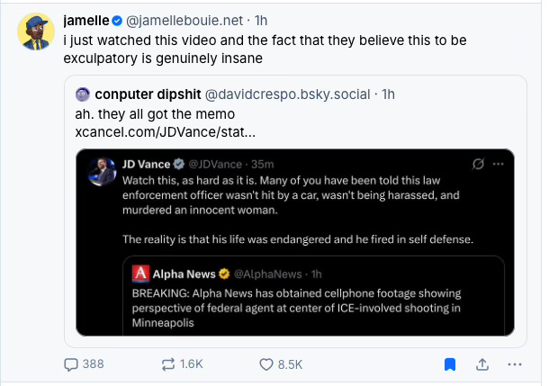 If you have seen the multi-angle video recreation from the New York Times, or the subsequently released cell-phone video (which I won’t be linking to and don’t recommend watching) by the ICE officer who committed the murder you know this to be a lie. The evidence is plain. This man shot a woman who was no threat to him. I do not know enough about the intricacies of the intersection of federal and state law around qualified immunity for armed officers of the state to predict whether or not this man will get off on a technicality, but we should know a murder when we see one.