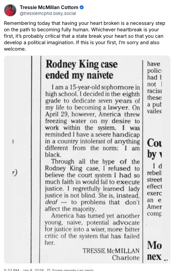 At BlueSky, writer and scholar Tressie McMillan Cottom shared a clip from her moment of breaking, a newspaper letter to the editor in response to the verdict in the Rodney King Trial.