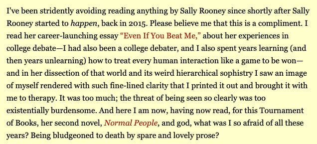 What we see here is a kind of analytical call-and-response that shows the work of critic in relationship to the audience. Rosner demonstrates her own understanding of what she perceives as the intentions and method deployed in Normal People (something all reviews should do, IMO), and then jumps from that understanding to a personal, but still analytical response. She’s mining her experience and understanding for insights that may illuminate the novel for the benefit of the reading audience.