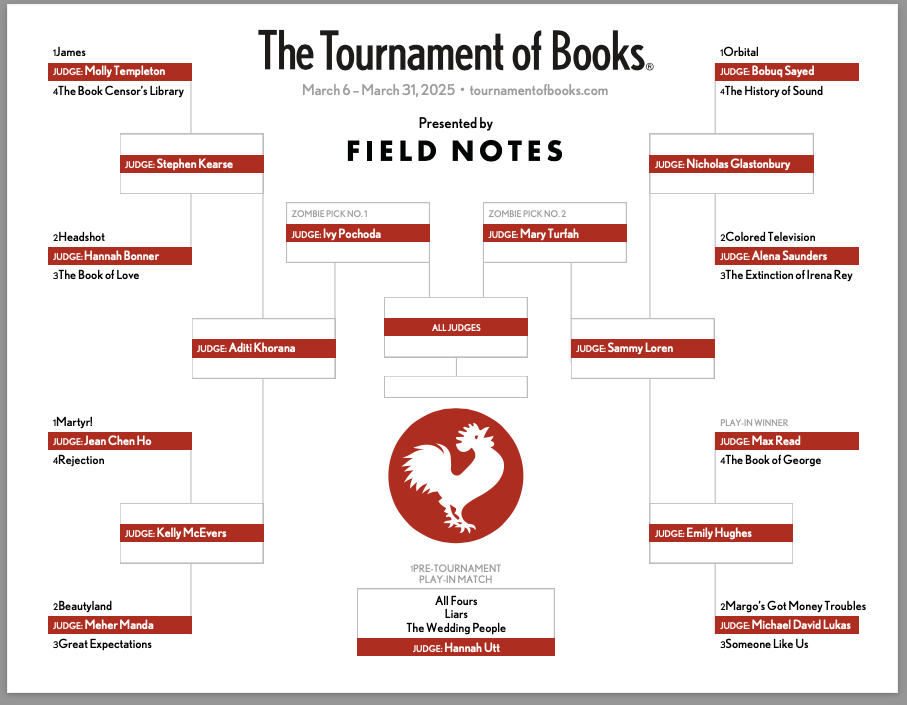 For those not familiar with the Tournament of Books - about to commence its 21st year on March 6th - it is a March Madness style competition for books where 16 books (following a three-book play-in round) compete for supremacy with one judge reading a pair of books and choosing a winner, while sharing the reasoning behind their judgement. You can see this year’s bracket just above this paragraph.