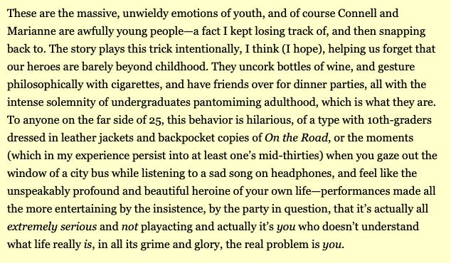 But this is also where the book lost me—where it abandoned me, really, I felt almost betrayed—as the ballad of Connell and Marianne enters its third act, and the sex becomes a clunky and violent metaphor, and the underlying farce is replaced by an oddly retrograde, overly pat morality play. Maybe the gravitas wasn’t a sly miracle, maybe it’s not actually a book about playing grown-up, maybe this story really is just an earnest telling of the most important years in its characters’ lives. How sad for them, if they are.