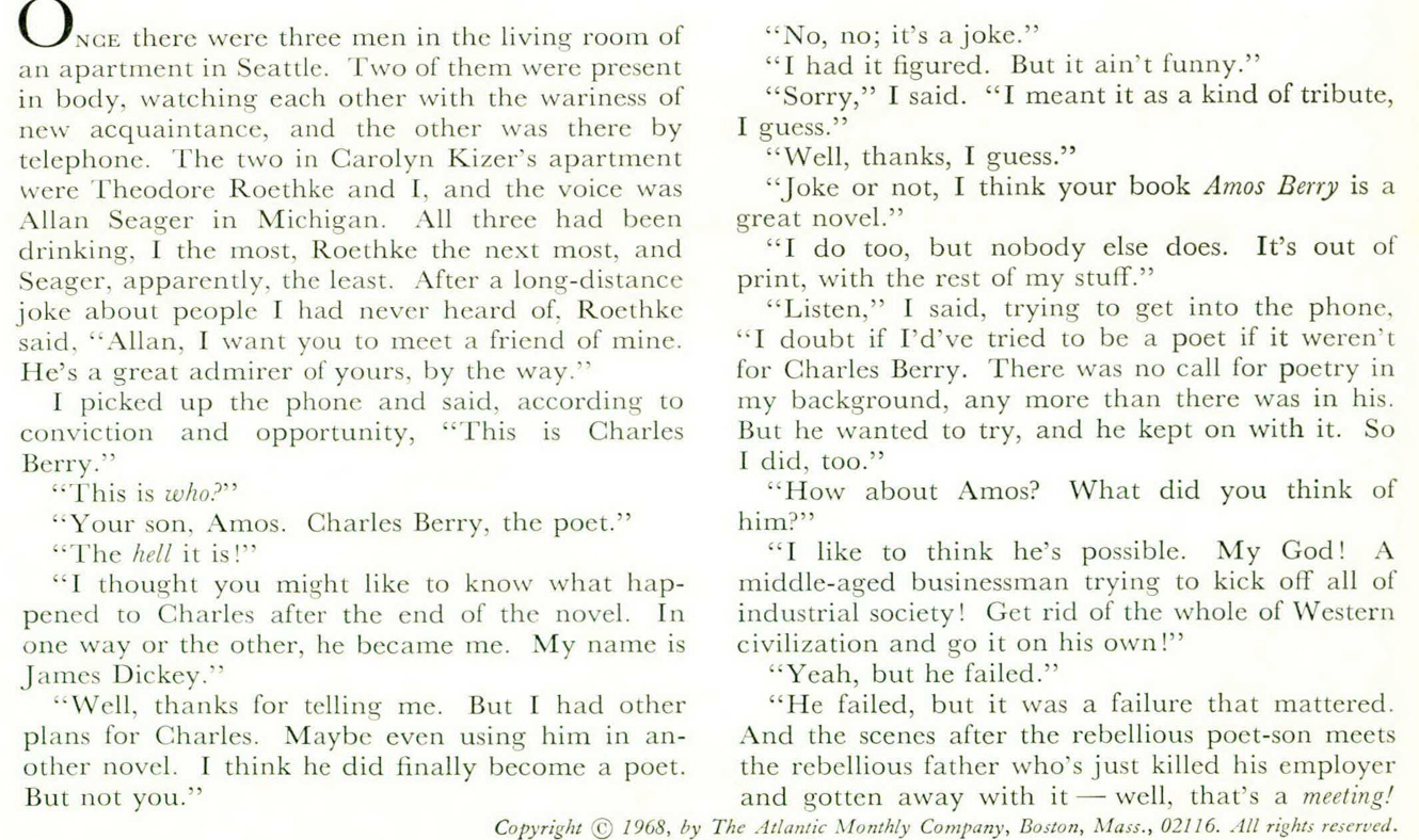 While Allan Seager is forgotten by everyone except me and the people who I can badger into reading about him, the influence of Amos Berry was profound. James Dickey, perhaps best known as the author of Deliverance, but most celebrated as a poet, told Seager that reading Amos Berry is what convinced him to try his hand at poetry. Upon being introduced to Seager by Roethke, Dickey actually said he was “Charles Berry,” a joke Seager did not appreciate.