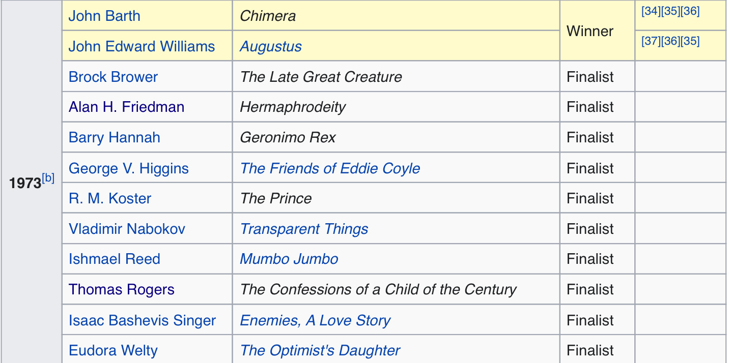 I have recently become obsessed with this list of National Book Award for fiction finalists from 1973.