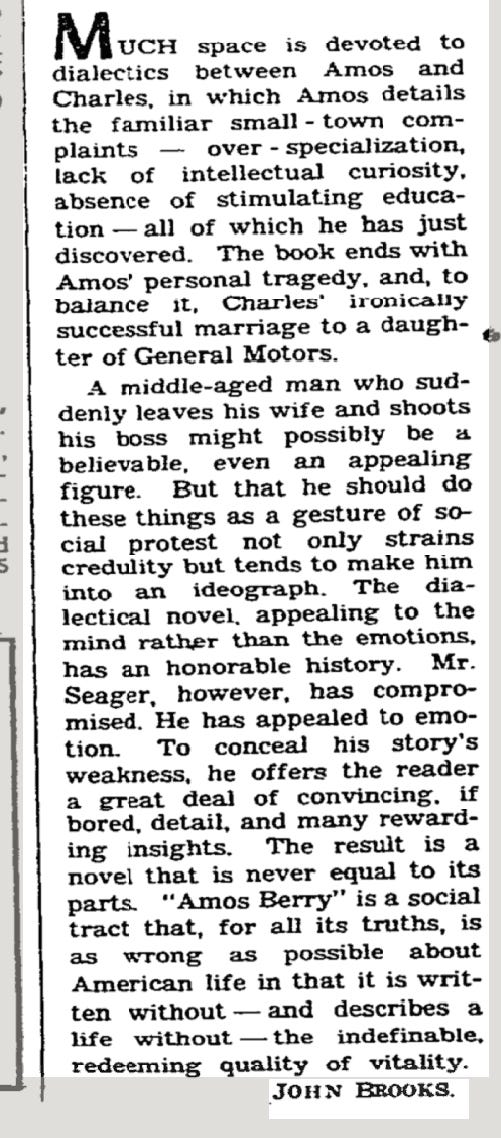 Brooks feels the novel owes it to the reader to be convinced that Amos Berry would do such a thing, but the more interesting question for Allan Seager in the 1950’s was why more people don’t challenge the status quo.
