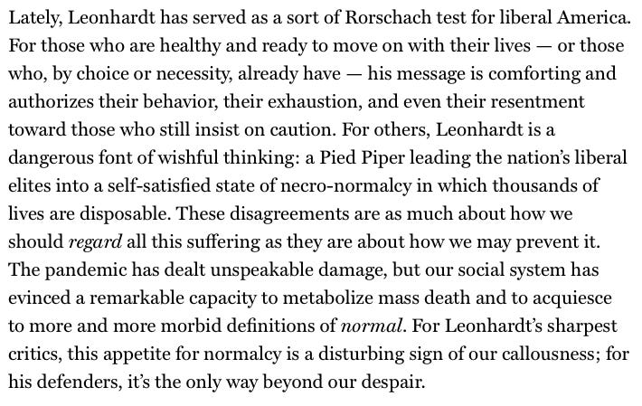 What to say? It’s complicated. I try my best to be transparent and trustworthy - Leonhardt would claim the same, I’m certain - and no one should substitute my judgement about Covid, David Leonhardt, books, or anything else for their own.