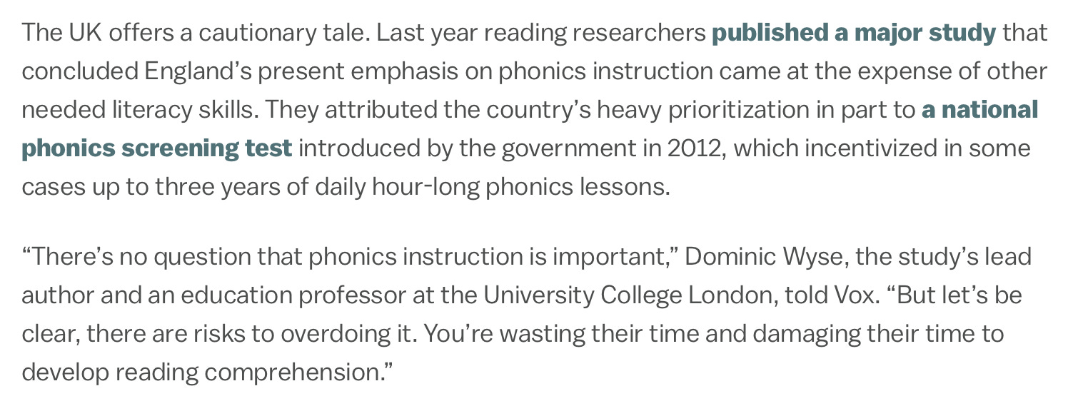 In fact, as Cohen reports, we already have a “cautionary tale” in Great Britain, which was on the phonics-for-all train over a decade ago, and now finds itself trying to pump the brakes, having overshot the mark on phonics instruction: