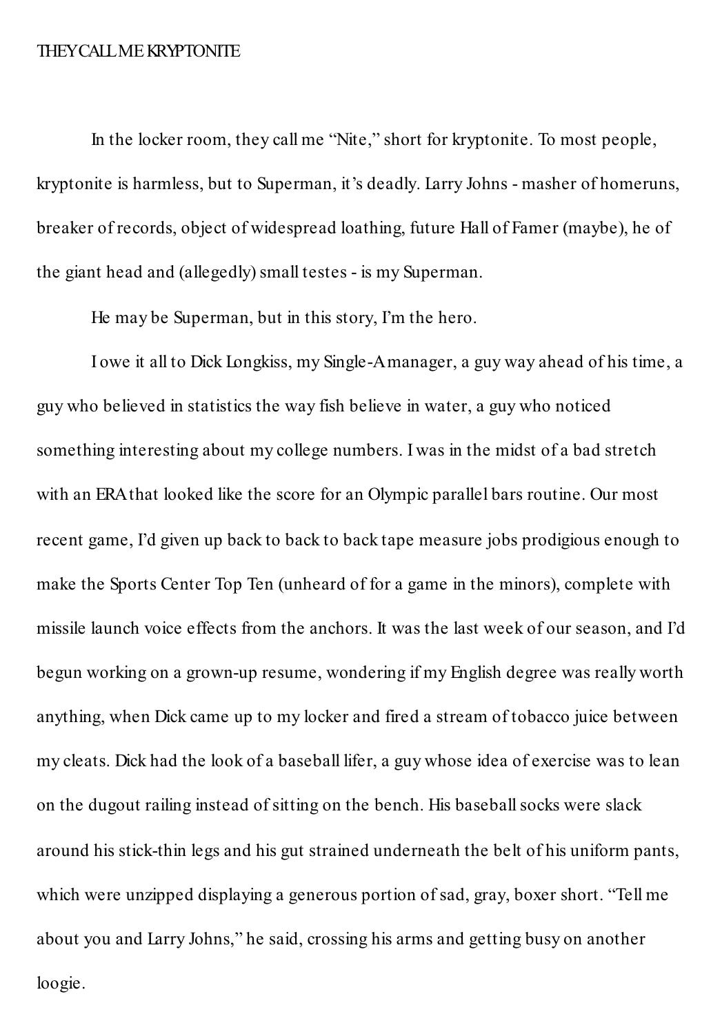Because this is my newsletter, and something of a safe space, this is where I confess that I wrote a failed baseball novel of my own, which is perhaps one of the reasons why I think it’s hard to write a good sports novel. It was (is?) titled, “They Call Me Kryptonite” and is told from the point of view of Major League pitcher who has a single talent: He has gotten an out against the league’s greatest player, Larry Johns (Barry Bonds, get it?), every single time. This magic dates back to their college days, but as the novel opens, our narrator is about to wash out of the minors until his minor league manager and future agent, Dick Longkiss, tells him that he’s being called up to the Big Leagues for a playoff series against Johns’ team, where he will be used in important situations, only against Johns, striking him out every time. The novel is primarily set years into the future when Larry Johns is on the verge of breaking Hank Aaron’s all-time home run record, and there’s a group of people who want to prevent that and have hit upon the strategy of trading the narrator - the kryptonite to Larry Johns’ Superman - to whatever team Johns is facing in order to have him suppress Johns’ home run total.
