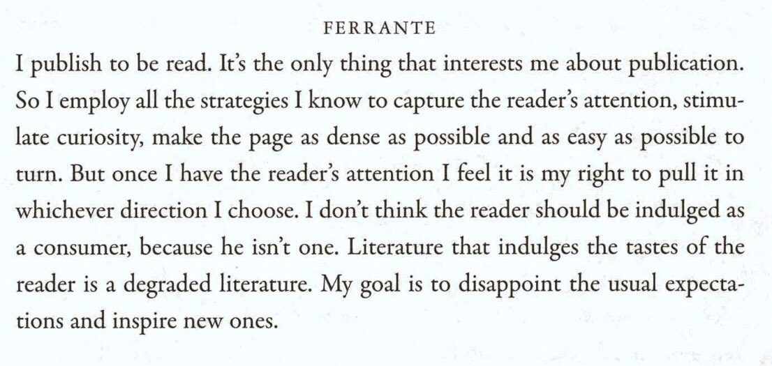 Another way of thinking about this was articulated by Elena Ferrante (My Brilliant Friend, et al.) in an interview with the Paris Review.